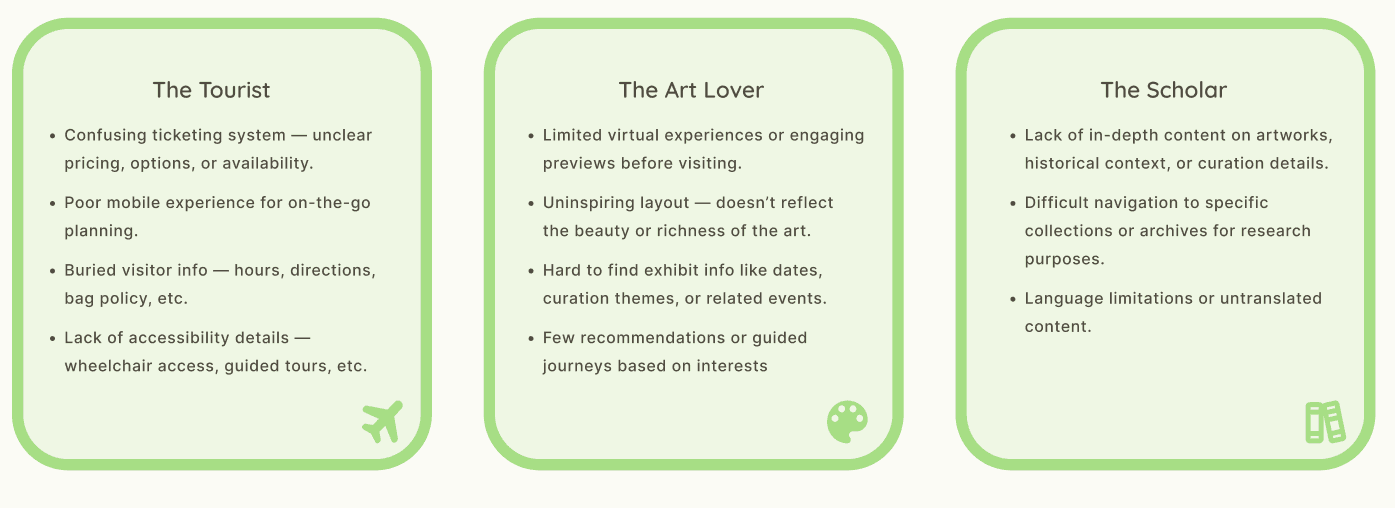 To start off the redesign, I started by gathering inspiration and doing a competitive analysis. I looked at top museum websites like The Met, The British Museum, and The Louvre to see how they structure their pages, present content, and guide users through ticket booking and exploring exhibits.