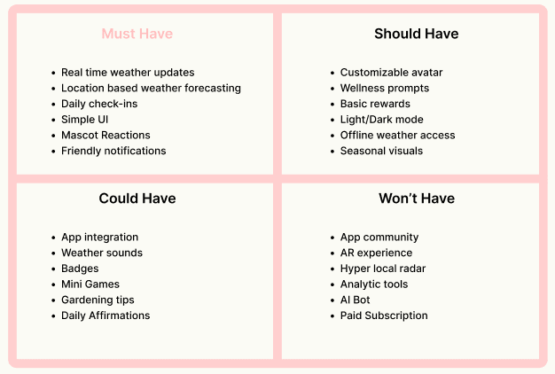 To prioritize what features and elements matter most for Nimbus, I used the MoSCoW method—breaking things down into what the app Must have, Should have, Could have, and Won’t have (for now). This helped me stay focused on the core experience I want to deliver while leaving room for future ideas without overloading the first version.